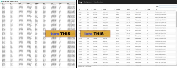 Now, we are going to create a view from scratch utilizing a database of 2 million records comprised of used car data.